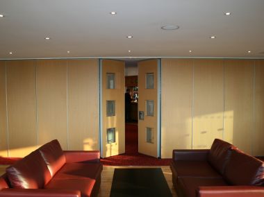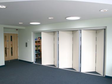 The flat panels are hinged together and stack at one or both ends when not in use. One end panel is usually a pass door which can be very useful. Sound reductions of up to Rw49dB are available as standard.
